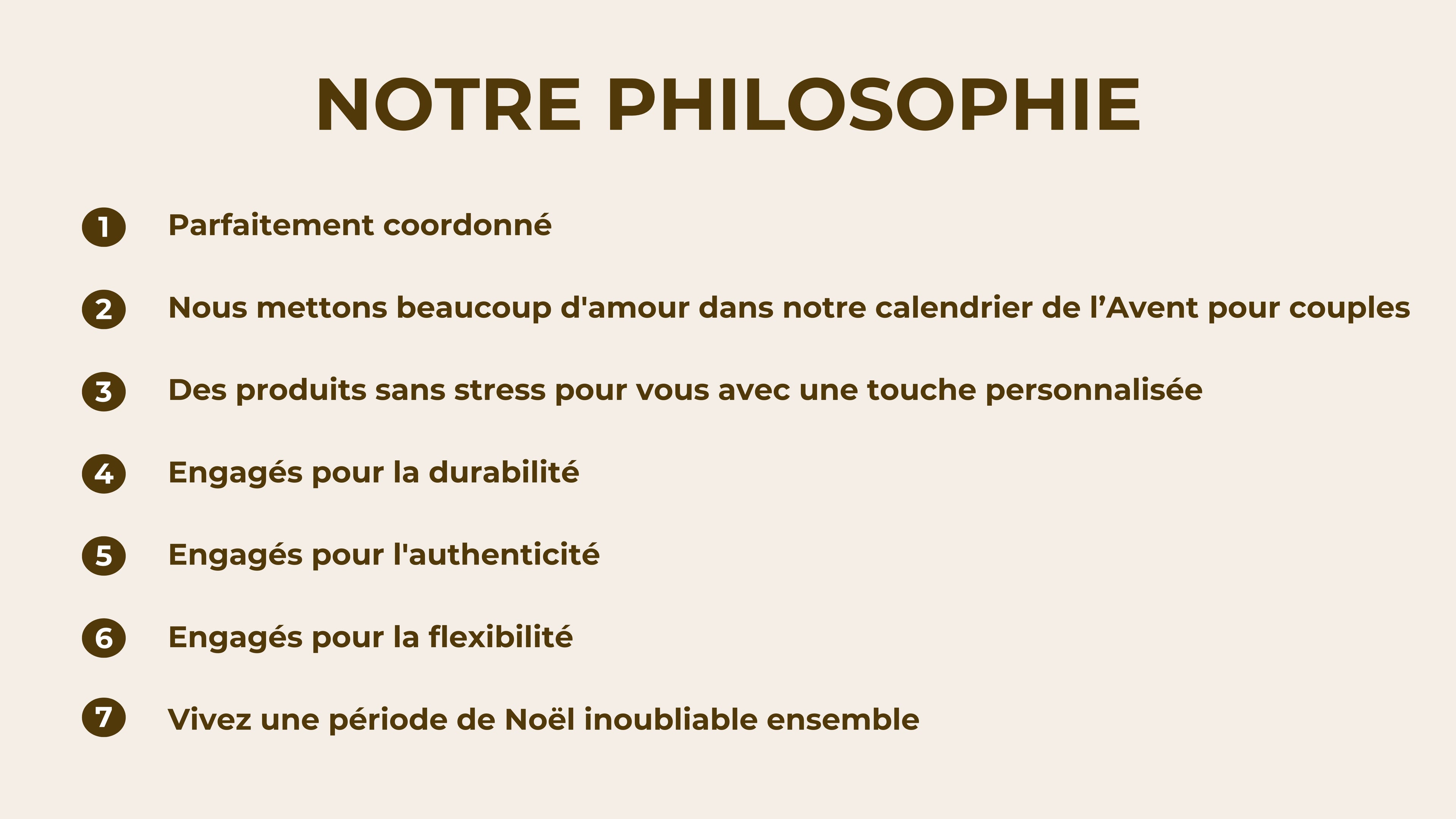 Nous sommes Louis, Sophie, Marie et Nicolas - deux couples qui sont de proches amis depuis de nombreuses années. Notre amitié est marquée par des expériences partagées et des traditions, y compris la création de calendriers de l’Avent pour nos partenaires. Chaque année, nous consacrons beaucoup de temps et d'efforts à créer des calendriers uniques remplis de lettres manuscrites, de cartes, de petits cadeaux et bien plus encore. Ces calendriers ont apporté beaucoup de joie à nos partenaires et ont rendu la période précédant Noël vraiment spéciale.Mais aussi belle que soit cette tradition, elle demandait toujours beaucoup d’effort. La production des calendriers n'était pas seulement chronophage, mais aussi coûteuse. La question s'est aussi posée : pourquoi une seule personne devrait-elle profiter des surprises d'un calendrier de l’Avent ? Cette expérience partagée pourrait rendre cette période encore plus spéciale et renforcer vos liens, alors nous avons trouvé une solution. Nous avons créé un calendrier de l’Avent qui est non seulement sans stress et abordable, mais qui apporte également de la joie aux deux partenaires et les rapproche encore plus.